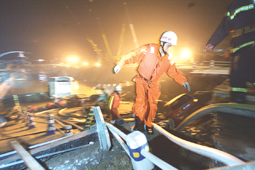 “馬路突然下陷,路面傾斜成了六七十度的坡。我把握不住方向,摩托車直接撞上了路邊的隔離墩。我感覺整個大地都在震動,周圍的塔吊也都傾倒了!苯饑w說,當時他完全懵了,“我第一反應就是拿出對講機向隊里匯報情況!眳R報完情況,金國飛趕緊往路面上爬,然后在現(xiàn)場參與了一夜的救援。