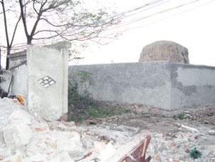 記者趕到鄂州那天,已是日暮時(shí)分。在當(dāng)?shù)鼐用竦闹敢,記者才找到摩崖石刻。只見一塊褐色的石頭,已被兩米高的水泥墻圍了起來。鏡頭稍微拉開一點(diǎn),這個(gè)國家重點(diǎn)保護(hù)文物四周,便是拆遷后的殘?jiān)珨啾冢瑥U棄的磚頭、鋼筋、破布散落一地。冬日夕陽的斜照下,一片蕭索。