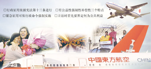 記者在采訪中了解到,我國目前沒有對行政征用進(jìn)行專門的立法,行政征用除了有憲法的依據(jù)外,還散見于其他法律法規(guī)之中,如涉及消防、抗洪、抗震等。但針對征用機(jī)場、客機(jī)的具體規(guī)定,還是空白。