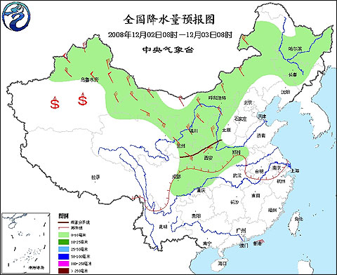 2008年12月2日8時(shí)—12月3日8時(shí)全國降水量預(yù)報(bào)圖