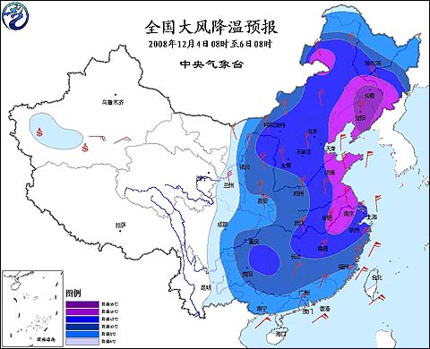 中央氣象臺2008年12月4日06時繼續(xù)發(fā)布寒潮橙色警報: