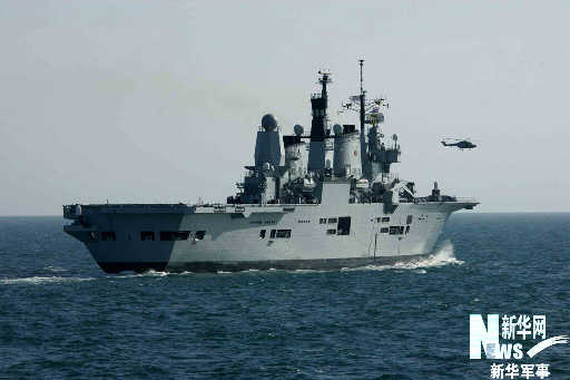 參加聯(lián)合演的英國海軍“皇家方舟”號航母艦和“山貓”直升機。查春明 攝