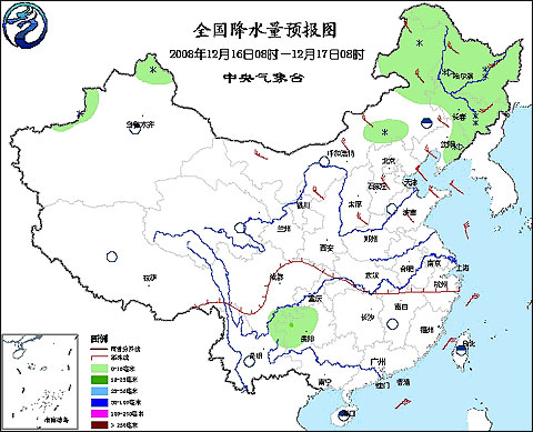 中央氣象臺(tái)2008年12月16日06時(shí)發(fā)布未來三天天氣預(yù)報(bào):