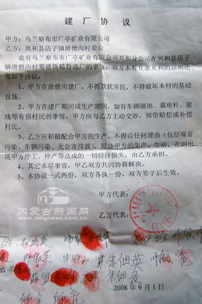 興和縣店子鎮(zhèn)蘆葦溝行政村村主任師振高與烏蘭察布市廣亭公司簽了一份協(xié)議,內(nèi)容大意是這個公司可以在當(dāng)?shù)夭设F礦,但要保證當(dāng)?shù)鼐用癜踩!這份看似毫無意義的協(xié)議卻在當(dāng)?shù)厥钟行В迕穸颊J(rèn)為這是合法的采礦企業(yè),而企業(yè)也變得更加大膽,并在村主任的協(xié)調(diào)下與村民以兩千元一畝的價格購下了唐僧溝村舊村址,說要建成一個大中型的鐵礦石浮選廠。