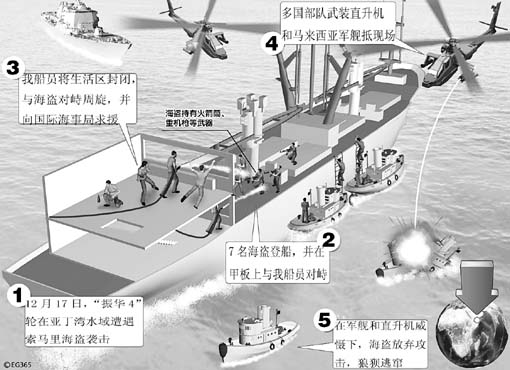 北京時(shí)間12月17日16時(shí)45分,亞丁灣的洋面,在激烈較量4個(gè)多小時(shí)后,中國(guó)“振華4”輪成功逼退了登船企圖劫持的海盜。這是今年在亞丁灣海域遭遇劫持的輪船中,通過(guò)船員激烈反劫持自救和國(guó)際力量援助成功戰(zhàn)勝海盜的第一例。