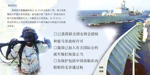 中央軍委法制局有關(guān)負(fù)責(zé)人在接受媒體采訪時(shí)說,中國(guó)軍艦赴亞丁灣、索馬里海域?qū)嵤┳o(hù)航的行動(dòng),是根據(jù)聯(lián)合國(guó)安理會(huì)決議作出的決定,完全符合有關(guān)國(guó)際法的規(guī)定。
