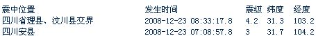 據(jù)地震臺(tái)網(wǎng)測定,北京時(shí)間2008-12-23 08:33:17.8 在四川省理縣、汶川縣交界(北緯31.3,東經(jīng)103.2) 發(fā)生4.2級(jí)地震。成都市區(qū)震感明顯。