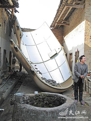 12月23日9時15分左右,當(dāng)天上午發(fā)射的“風(fēng)云二號”06星整流罩的一半掉落在我。ń鳎埬峡h九連山古坑村,該縣人武部已將該部分殘骸成功收回(見圖)。