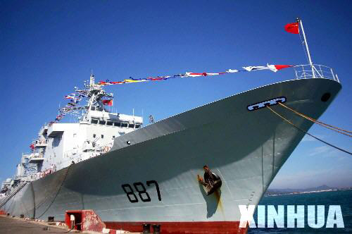 該艦于2003年7月1日黃埔造船廠下水,2004年4月服役,編入南海艦隊。是我國自行設計建造最大補給艦,艦長171.4米,寬24.6米,吃水深度9米,排水量23000噸,兩臺柴油發(fā)動機雙軸驅動,可同時為兩艘以上艦船補給,主要用于遠洋補給。最大航速19節(jié),續(xù)航力10000/14節(jié)。船員130名,推測物資容量為燃油10500噸,水250噸,干貨彈藥680噸。裝備4門76F雙聯(lián)裝37mm 63倍徑機炮。