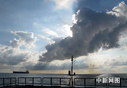 一邊想著暈不暈船的事,一邊信步從前甲板走到尾甲板,還順手在甲板上拍了幾幅“?凇迸灪叫旭R六甲海峽的風光片,瞅著拍攝到的海天相接、軍艦劈浪、陽光與烏云“斗智斗勇”的場面,自我感覺相當不錯。(完)