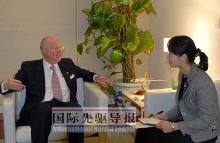 國際先驅(qū)導(dǎo)報記者熊爭艷發(fā)自北京 在美國駐華使館官員陪同下,經(jīng)過幾道關(guān)卡,在新使館大樓的會客室內(nèi)才見到了兩鬢斑白、神采奕奕的雷德大使。不到半個小時的采訪中,雷德思路清晰,語言幽默,并時常發(fā)出爽朗的笑聲。