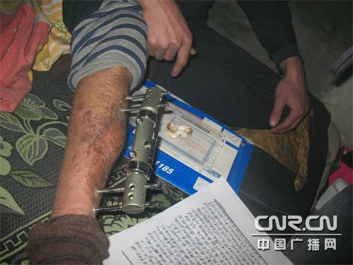 走進李權(quán)柱租來的不足10平米的小屋時,屋里彌漫著嗆人的煤煙,但屋里的水缸卻結(jié)了冰。李權(quán)柱和他的愛人蜷縮在炕頭,挽起薄薄的秋褲,記者看到,一個60公分長的鐵夾深深地嵌進李權(quán)柱的小小腿上,皮膚和鐵夾相連的地方還在往外流著膿水,李權(quán)柱就拿紙纏在鐵夾上。