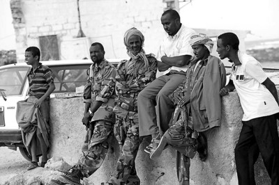 在沿途一個較大的城鎮(zhèn)休整時,許多當(dāng)?shù)鼐用窈闷娴厣锨皣^我們這兩名中國記者,這時與記者隨行的5名士兵便如臨大敵,小心翼翼地站在記者身旁貼身保護。整段公路如今都在政府軍控制之下,沿途記者總共通過了20多個武裝哨卡,每個哨卡的士兵都會友好地向記者打招呼。將近7個小時的車程之后,記者終于抵達邦特蘭省首府加羅韋。