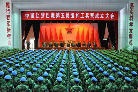 應(yīng)聯(lián)合國請求,經(jīng)中央軍委批準,中國赴黎巴嫩維和工兵營,今天(20日)在成都軍區(qū)駐滇某工兵團正式成立。上午10時,在雄壯的軍歌聲中,頭戴藍色貝雷帽、著07式迷彩服的275名官兵英姿勃發(fā)地接受了檢閱。