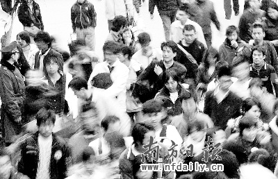 來自柳州的劉先生昨天搭乘K301次列車抵達廣州,他帶著老家的特產(chǎn)———烤鴨、雞、花生,打算送給在清遠鞋廠打工的工友和在廣東的老鄉(xiāng)。陜西寶雞人包永江前年因為一次意外的車禍致殘。昨天他拄著一雙拐杖,在廣州火車東站和諧號出站口等妻子。這是他第一次外出,因為妻子在自己打工的那家紡織廠里給他介紹了一份看門的工作,他從大年二十八就踏上了南下列車。為了省80元路費,他選擇先從寶雞轉(zhuǎn)到漢口,再從漢口乘慢車抵達廣州。因為妻子在黃金周長假期間加班,昨天下午才能從深圳趕過來接他。至昨天,他已經(jīng)連續(xù)在車站等了6天。他希望新年里,自己能為妻子分擔(dān)一些負(fù)擔(dān),兩個人今年可以還清家里的欠帳。
