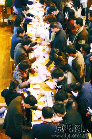 今天上午,節(jié)后首場(chǎng)綜合招聘會(huì)在(北京)農(nóng)展館舉行,人潮涌動(dòng)的熱烈場(chǎng)面再次凸顯了2009年嚴(yán)峻的就業(yè)形勢(shì)。再過(guò)幾天,北京市及中央國(guó)家機(jī)關(guān)公務(wù)員招考也將陸續(xù)進(jìn)入面試階段。
