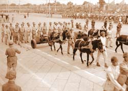 他說,當(dāng)時炮兵方隊是第四個通過天安門廣場的隊伍,以輕迫擊炮、重迫擊炮、戰(zhàn)防炮、山炮和野炮、榴彈炮、高射炮等7種上百門火炮陣容出現(xiàn)。火炮由小到大,由低到高,依次前進,有的火炮是用騾馬拽著通過天安門的。
