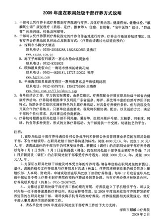 深圳市麒麟山療養(yǎng)院作為全市干部的體檢療養(yǎng)保健基地,負(fù)責(zé)承辦在職局處級(jí)干部的療養(yǎng)。這則由深圳市麒麟山療養(yǎng)院發(fā)給深圳“各單位”的公告被深圳市建設(shè)局貼到了該局的官方網(wǎng)站上。公告顯示,深圳“各單位”在職局處級(jí)干部可以憑療養(yǎng)卡或療養(yǎng)票到療養(yǎng)院進(jìn)行療養(yǎng),具體療養(yǎng)內(nèi)容包括:健康咨詢、健康體驗(yàn)康復(fù)理療(藥浴、足療、推拿)、“野戰(zhàn)營(yíng)”拓展訓(xùn)練、釣魚及網(wǎng)球等。干部還可以憑療養(yǎng)票到療養(yǎng)院指定的療養(yǎng)合作基地進(jìn)行療養(yǎng),現(xiàn)有的療養(yǎng)基地包括深圳市麒麟山療養(yǎng)院、深圳市小梅沙大酒店、清遠(yuǎn)市的頤和溫泉度假山莊、惠州市的平海海濱溫泉旅游度假區(qū)、惠東市的海王子海濱假日酒店。