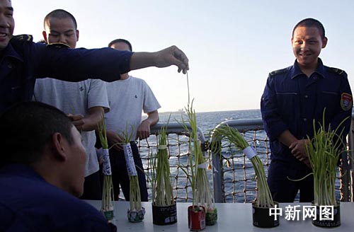 比一比,看看誰養(yǎng)的蒜苗長得高。中新社記者 孫自法 攝