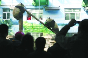 8時,記者看到,8只大熊貓在運動場內(nèi)仨一群,倆一伙地圍在一起大口嚼著竹子。玻璃窗外圍滿了來送大熊貓的北京游客。
