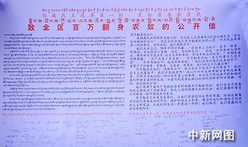 中新網(wǎng)拉薩3月27日電(記者柳俊武)3月28日,西藏各族民眾將迎來(lái)首個(gè)“百萬(wàn)農(nóng)奴解放紀(jì)念日”,西藏自治區(qū)也將在拉薩隆重紀(jì)念西藏民主改革50周年。27日晚,西藏民主改革第一村——山南地區(qū)克松居委會(huì)居民,懷著激動(dòng)的心情,向中新社、中新網(wǎng)寄來(lái)了他們致全區(qū)百萬(wàn)翻身農(nóng)奴的一封公開(kāi)信。全文如下: