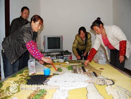 據(jù)介紹,整幅圖畫高一點八三米,寬三點零五米,以木板為底,畫面色彩搭配全部用當?shù)厥a(chǎn)的玉米、黃豆、小豆、黑豆、蕎麥等二十多種雜糧拼貼。畫面內(nèi)容以山水環(huán)繞的棗樹村為背景,溫家寶總理居中,左右分別是棗樹村抗震救災(zāi)英雄石光華等村民。