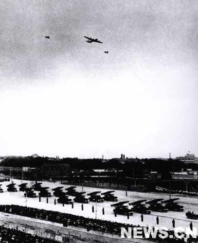 當(dāng)?shù)孛娌筷?duì)經(jīng)過(guò)廣場(chǎng)時(shí),在天空出現(xiàn)了英勇的鐵鷹,兩架殲擊機(jī)護(hù)送著一架領(lǐng)航機(jī)飛在前1954面,接著重轟炸機(jī)、噴氣式轟炸機(jī)和殲擊機(jī),一隊(duì)一隊(duì)地掠過(guò)天安門上空。