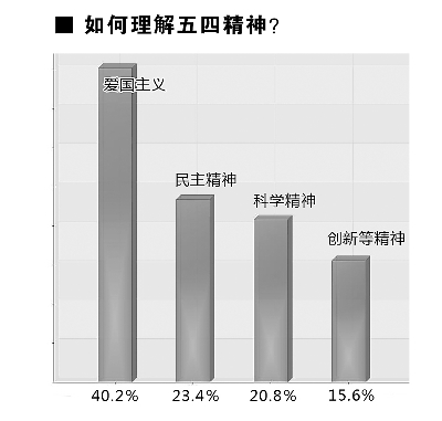 在對(duì)于五四精神的理解上,40.2%的受訪者選擇了“愛(ài)國(guó)主義”,認(rèn)為這是五四精神中首先需要傳承的精神遺產(chǎn),23.4%選擇“民主精神”,20.8%選擇“科學(xué)精神”,15.6%選擇“創(chuàng)新等其他精神”。調(diào)查顯示,國(guó)家、民族在大學(xué)生心中占據(jù)神圣的地位,75.4%的受訪者表示自己“為作為中國(guó)公民感到自豪”。