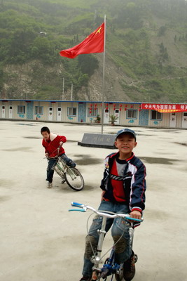 一間板房的山墻上掛著黑板,粉筆寫的“領(lǐng)取傷亡補助的通知”已經(jīng)被雨水沖刷得模糊了!鞍宸砍鲎狻钡男V告和“自救飯店”“家庭旅店”的招牌隨處可見。映秀小學鑲嵌在居民區(qū)里,大門上的中國結(jié)、紅燈籠和院子中央鮮艷的紅旗十分醒目。