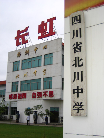 “5.12”地震中,北川中學的2800多名師生里有上千人遇難。除了一棟老教學樓,校舍全部倒塌損毀。為了安全,據(jù)長虹培訓中心主任侯慶國介紹,地震后第二天,學校的很多師生就轉移到了綿陽市九州體育館。后來在長虹集團的幫助下,北川中學于5月19日在其培訓中心復課。復課儀式上,長虹集團送來了從學校廢墟中找到的校牌——這段故事已成為佳話。