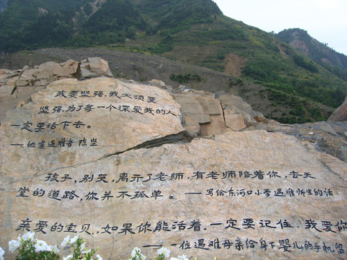 在亂石中,記者看到了一些類似煤炭的石塊。這樣的石塊應(yīng)該是千百年掩埋地下,又被地震“翻”出來的。解說員介紹說,“5.12”大地震的能量相當于5600顆原子彈爆炸,而東河口不幸成為地震的最后一個爆發(fā)點。地震甚至將一棵埋在地下超過1500年、已經(jīng)部分炭化的大樹翻出地面,“重見天日”。如今,它成為遺址公園的一個標志。
