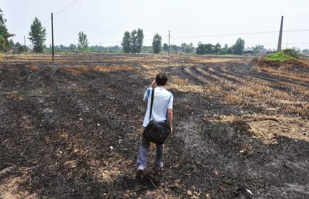 “這個(gè)村地里留下的秸稈,不敢說是100%,至少90%都是燒了的!币徽诘乩锊逖淼拇迕窀嬖V記者,幾天前他就將地里的秸稈全部燒了,清理完畢后,在地里灌上水準(zhǔn)備插秧!笆崭顧C(jī)收完麥子后,還有半茬樁子留在地里,弄起來太麻煩,一把火燒了干凈!