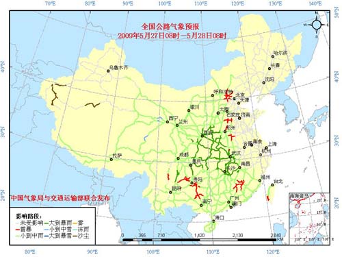 中新網(wǎng)5月27日電 中國氣象局與交通運(yùn)輸部今日聯(lián)合發(fā)布“端午節(jié)”期間主要公路氣象預(yù)報(bào)。