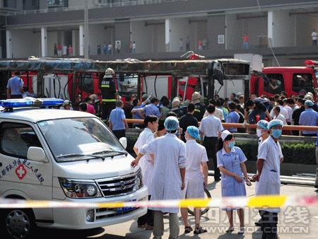 據(jù)中央電視臺(tái)記者介紹,目前,事故公交車(chē)已被拖走。記者在現(xiàn)場(chǎng)看到,事故公交車(chē)被燒的嚴(yán)重變形,座位全部被燒焦了。事故路段近300米已戒嚴(yán),地上有近30米長(zhǎng)的帶血的腳印。目前現(xiàn)場(chǎng)有群眾圍觀。