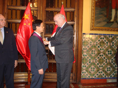 中新網(wǎng)6月23日電 據(jù)中國(guó)外交部網(wǎng)站消息,6月22日,秘魯外長(zhǎng)加西亞向即將離任的中國(guó)駐秘魯大使高正月授予秘魯太陽(yáng)大十字級(jí)勛章。我館政務(wù)參贊虞越、秘第一副總統(tǒng)詹彼得里、外貿(mào)旅游部長(zhǎng)阿勞斯、部分政界高官、國(guó)會(huì)議員、駐秘使團(tuán)代表、企業(yè)界等各界友好人士等50多人出席。