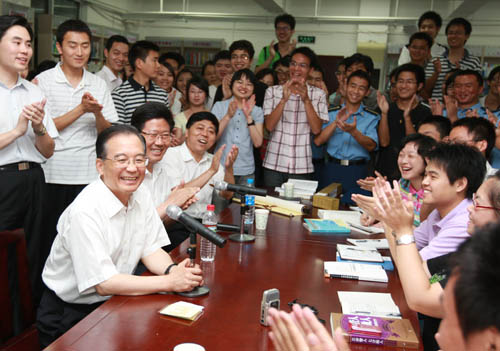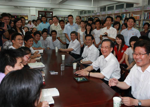溫家寶:我非常高興來到湖南大學(xué),看望廣大師生,我向你們表示問候。湖南大學(xué)是千年學(xué)府、百年名校,為國家培養(yǎng)了許多棟梁之才,這是你們的光榮!你們身上承擔(dān)著很重的責(zé)任。我想引用一位詩人的名言,他叫布朗寧,他曾經(jīng)說:“我心寄托在什么地方,讓我腦也就寄托在那里!蔽覀儑业奈磥,寄托在青年學(xué)生的身上,寄托在年輕一代!因此,我來到年輕人中間,腦子里的寄托也就是希望跟你們說幾句心里話。我希望你們懂得奮斗,準(zhǔn)備迎接困難。青年學(xué)生是富于理想的,這是你們的優(yōu)勢,但是人生的道路是不平坦的,你們要以徹底的覺悟、不屈不撓的意志和艱苦的努力,去面對和迎接這些困難。我相信,你們都有遠(yuǎn)大的理想,但是還要腳踏實(shí)地。你們經(jīng)過幾年的學(xué)習(xí),即將走向社會(huì),要記住六個(gè)字,就是“此時(shí)、此地、此身”!按藭r(shí)”,就是現(xiàn)在應(yīng)該做的事情,就立即做起來,不要拖延到以后;“此地”,就是要在你所處的崗位做起,為國家和人民作出貢獻(xiàn),不要等到別的地方;“此身”,就是自己應(yīng)該而且能夠做的事情,就要勇于承擔(dān),不要推給別人。