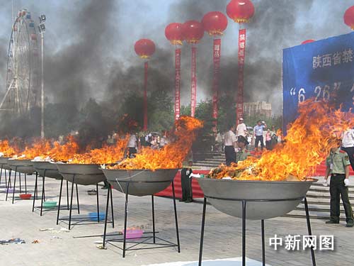 記者在現(xiàn)場看到,公開銷毀的毒品包括海洛因、鴉片、麻古、冰毒、搖頭丸、氯胺酮、管制藥品等,分別放置在12口大鍋內(nèi),公安人員給上面澆上煤油等易燃物品。隨著陜西省公安廳廳長王銳宣布銷毀毒品令,這些毒品被付之一炬。
