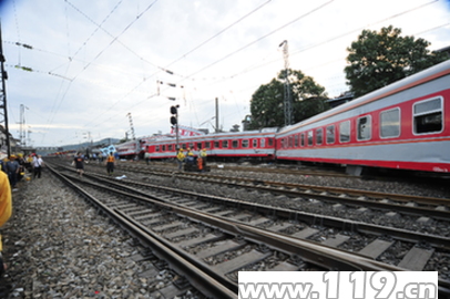 6月29日2時(shí)33分許,湖南公安消防總隊(duì)郴州市消防支隊(duì)指揮中心接到報(bào)警:飛虹橋道口兩列客運(yùn)火車相撞(K9017次列車撞上了稍前脫軌的K9063次列車),其中一列撞上附近一民房,請(qǐng)求救援。