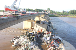 14時(shí),鐵力市政府緊急召開了關(guān)于哈伊公路鐵力市呼蘭河大橋橋體壓塌事件的第一次新聞發(fā)布會(huì)。據(jù)鐵力市委常委、副市長李慶生介紹,29日2時(shí)34分,鐵力市公安局110指揮中心接到群眾報(bào)警,位于伊哈公路123公里處的鐵力市呼蘭河大橋,被由哈市方向開來的一輛車號(hào)為黑F51650的拉鋼的材超重掛車壓塌橋體,該車和隨后趕來的車輛掉入橋下2米深的水中。