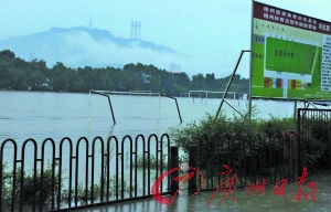 被譽(yù)為中國(guó)足球“明星搖籃”和培養(yǎng)中國(guó)足球裁判員“黃埔軍校”的廣西梧州體育訓(xùn)練基地,位于緊臨西江的梧州市蝶山區(qū)龍湖鎮(zhèn),是原國(guó)家體委與地方共建的全國(guó)三大足球訓(xùn)練基地之一。前日以來,隨著西江水位的不斷上漲,該體育訓(xùn)練基地開始不斷被水蔓延。昨日下午,記者趕到時(shí),上百畝訓(xùn)練場(chǎng)地全部被大水淹沒,水深處達(dá)兩米多,球場(chǎng)只露出一截40多個(gè)球門,讓人們還能認(rèn)得出來這里原來是一處足球場(chǎng)地。同時(shí),記者也看到附近居民的房屋的一樓已經(jīng)泡在水中。(記者王廣永)