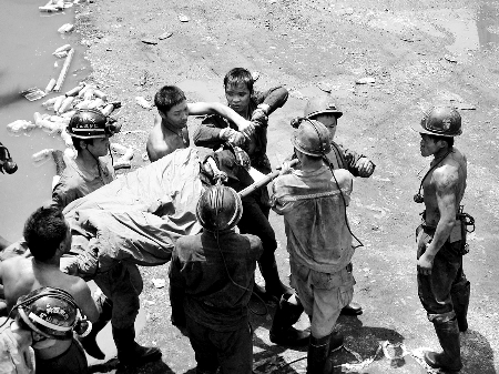 11時35分,施救人員把堵塞該巷道的淤泥和煤塊清開,發(fā)現(xiàn)里面有3名被困的工人,而且這3名工人還能說話,意識也是清醒的。施救人員立即用黑布將3人的眼睛包裹住,然后每8名救援人員用擔(dān)架抬起一名被困者,慢慢將他們送至井口。此時,早已聞訊的醫(yī)務(wù)人員來到井口,分別為3名礦工輸液,以保持生命體能。