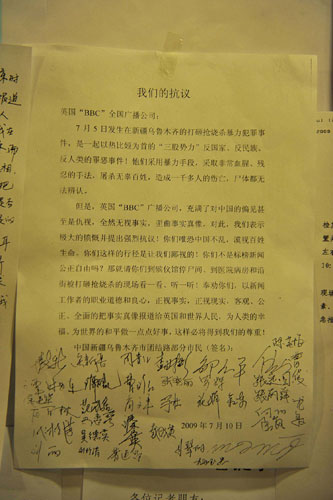 7月13日上午,當記者來到設在烏魯木齊海德飯店的新聞中心時,這里的工作人員反映說,連日來他們不斷接到當?shù)厥忻翊騺淼碾娫,反映西方媒體關于“7·5”事件的報道不但有失公充,而且無視基本事實,他們要求工作人員將他們的不滿和抗議轉告給相關的西方媒體記者。有些市民是直接將他們抗議信送到新聞中心,將其貼在那里。