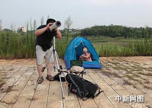 一位天文愛好者從南京到上海發(fā)現(xiàn)天氣不佳,連夜趕到銅陵,剛才記者遇到這位四十多歲的漢子時(shí),腳上全是泥巴,還正啃著燒餅。