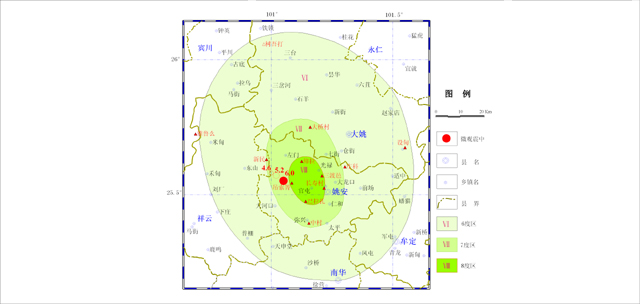1. 本次地震宏觀震中位于姚安縣官屯鄉(xiāng)官屯村-馬游村一帶,最大烈度為Ⅷ度,等震級(jí)形狀呈橢圓形,長軸走向?yàn)楸蔽飨,總面積6958平方千米。