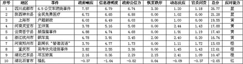 說明:本表數(shù)據(jù)為11位輿情分析師采用德爾菲法,對地方政府應(yīng)對網(wǎng)絡(luò)輿情表現(xiàn)進行分項評估后得出。其中政府響應(yīng)、信息透明度、政府公信力三項為常規(guī)指標,分值區(qū)域分別為-10~10分;恢復(fù)秩序、動態(tài)反應(yīng)、官員問責三項為特殊指標,分值區(qū)域分別為-5~5分、-3~3分、-3~3分。輿情分析師依據(jù)以上各項指標對政府表現(xiàn)分別做出評價,政府表現(xiàn)越出色、應(yīng)對越得體則得分越高,反之則得分越低。最終依據(jù)各項表現(xiàn)綜合所得總分,得出藍、黃、橙、紅四級警報級別,警報程度相應(yīng)由低到高。其中總分20.00分以上為藍色警報,政府應(yīng)對總體較為得體;總分15.00~19.99分為黃色警報,政府應(yīng)對有待進一步加強;總分10.00~14.99為橙色警報,政府應(yīng)對存在明顯問題;總分10.00分以下為紅色警報,政府應(yīng)對嚴重失當,存在重大缺陷。