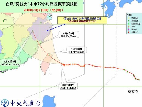 預(yù)計,“莫拉克”將以 每小時 15 公里左右的速度向西北方向移動,將于今天 傍晚前后登陸臺灣東北部,然后向福建北部到浙江中部一帶沿海靠近,并有可能于明天下午到后天早晨在向福建北部到浙江中部一帶沿海登陸。