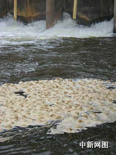 中新社徐州八月九日電 (邵國棟)記者今天來到受嚴重砷污染的江蘇省邳州市邳城鎮(zhèn)城河節(jié)制閘現(xiàn)場,十余名工人正在閘站上往河道里投放一種黃色的粉末。工人稱這種叫三氯化鐵的化學物質主要用來降低水體砷化物濃度,他們已經(jīng)在此晝夜堅守多日。