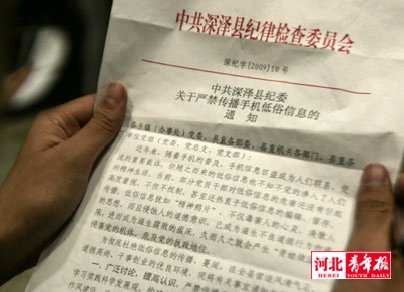 記者了解到,深澤縣委常委、紀(jì)委書記張慶民是此事的主要推動者之一。在他們的推動下,經(jīng)多次討論,并向深澤縣委多次匯報后,才出臺了“嚴(yán)禁傳播手機(jī)低俗信息的通知”。