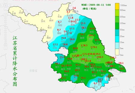 受“莫拉克”影響,10日江蘇淮河以南地區(qū)出現(xiàn)大范圍暴雨到大暴雨。據(jù)統(tǒng)計(jì),截至11日05時(shí), 江蘇38個(gè)臺(tái)站24小時(shí)雨量在50毫米以上,其中南通、泰州、鹽城、鎮(zhèn)江、揚(yáng)州共14個(gè)臺(tái)站在100毫米以上,最大雨量出現(xiàn)在姜堰(150.6毫米)。另據(jù)加密自動(dòng)站觀測,有118個(gè)站雨量在100毫米以上,最大雨量姜堰蔣垛(179.3毫米)。“莫拉克”還使淮河以南地區(qū)普遍出現(xiàn)7-8級(jí)大風(fēng),沿海9-10級(jí),最大風(fēng)速達(dá)11級(jí) (28.6m/s,射陽丹頂鶴保護(hù)區(qū))。