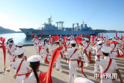 掌聲雷動(dòng),鼓樂(lè)喧天,駐三亞海軍某保障基地在軍港碼頭舉行隆重的歡迎儀式,迎接凱旋歸來(lái)的官兵。某保障基地司令員閻保健等領(lǐng)導(dǎo)及數(shù)百名官兵、家屬代表參加了歡迎儀式。
